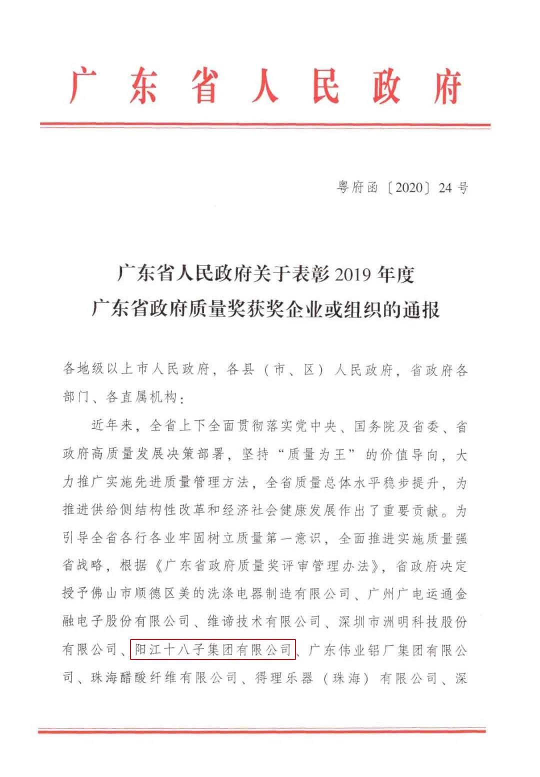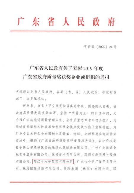 近日,廣東省人民政府發(fā)布了《關(guān)于表彰2019年度廣東省政府質(zhì)量獎(jiǎng)獲獎(jiǎng)企業(yè)或組織的通報(bào)》,10家企業(yè)榮獲2019年度廣東省政府質(zhì)量獎(jiǎng),其中,陽(yáng)江十八子集團(tuán)有限公司榮膺上榜,成為廣東粵西地區(qū)首家獲此殊榮的企業(yè)。