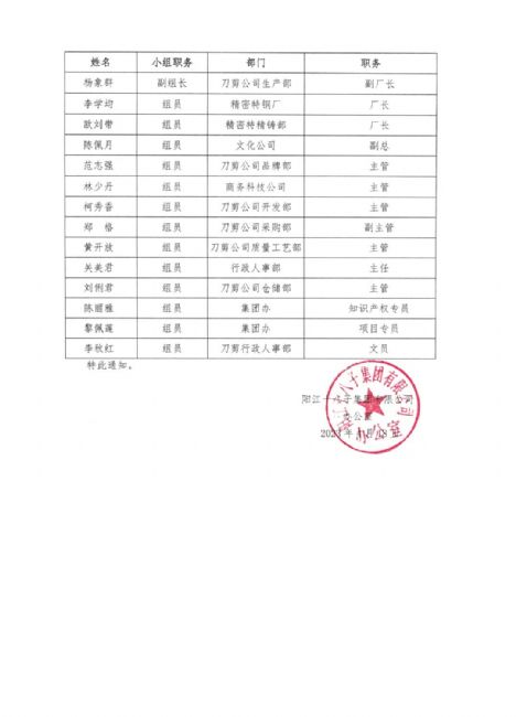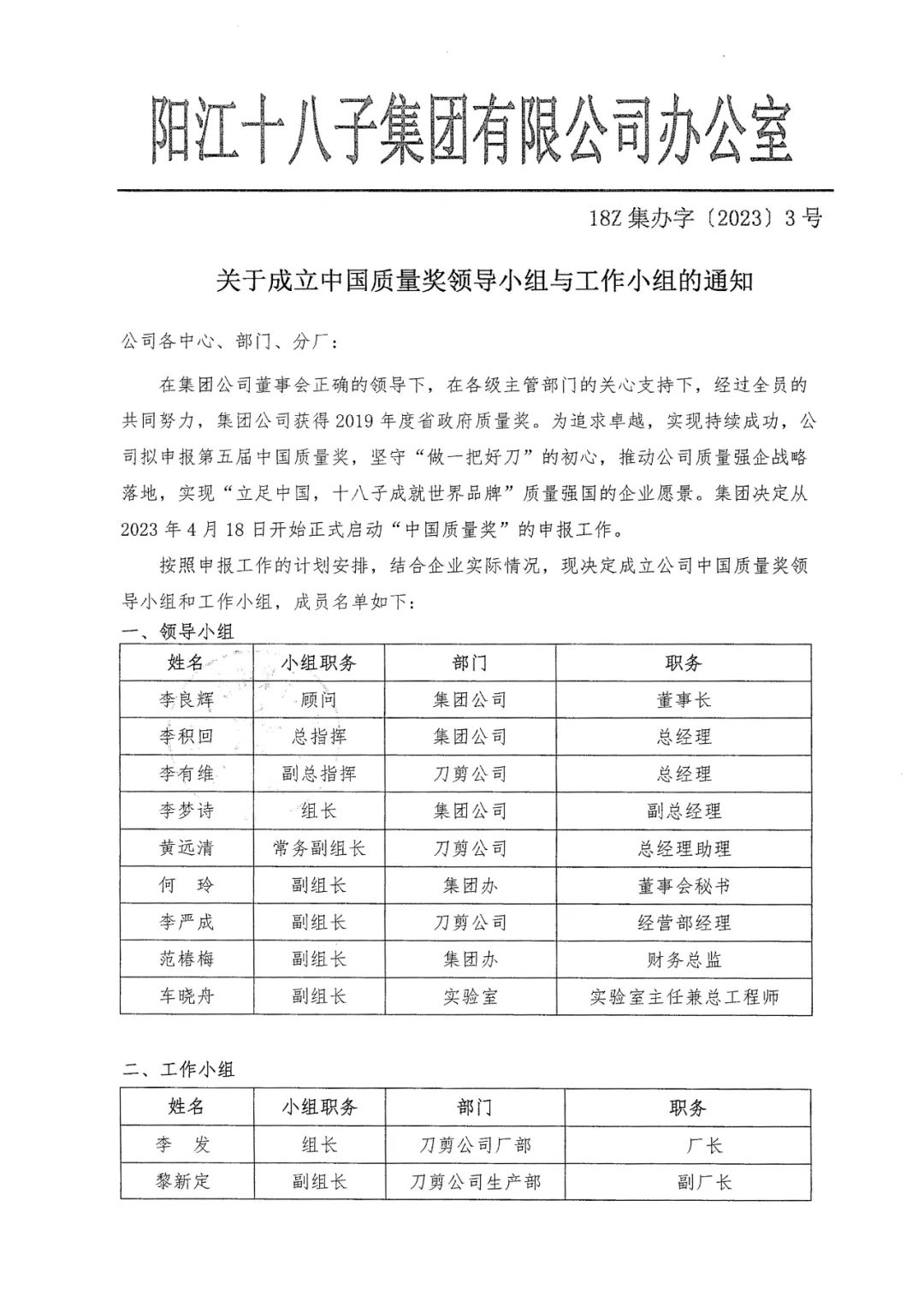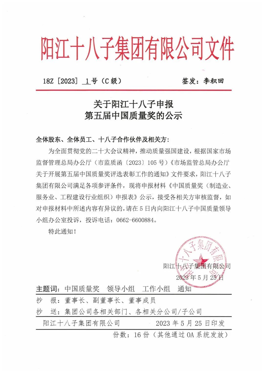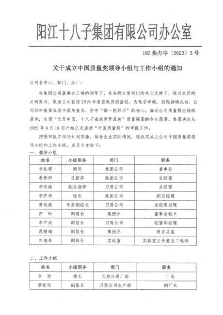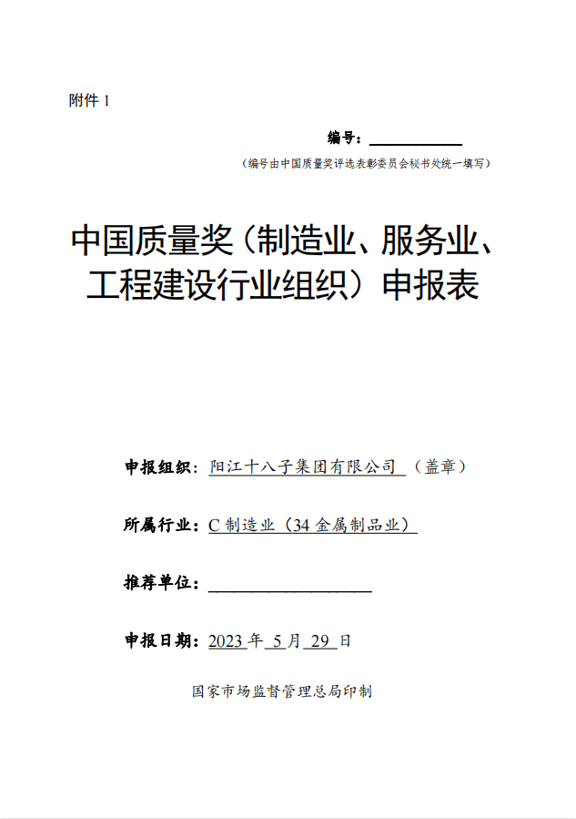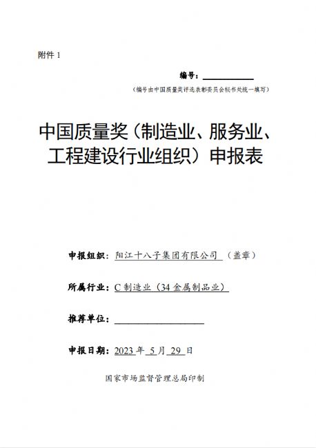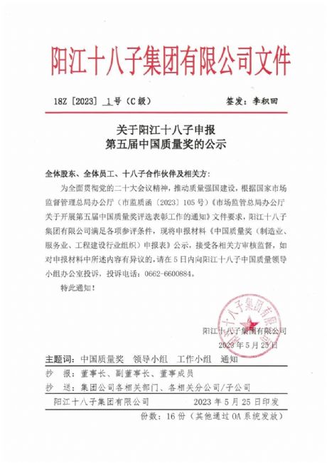 為貫徹黨的二十大會議精神,推動質(zhì)量強國建設(shè),根據(jù)國家市場監(jiān)督管理總局辦公廳(市監(jiān)質(zhì)函【2023】105號)《市場監(jiān)管總局辦公廳關(guān)于開展第五屆中國質(zhì)量獎評選表彰工作的通知》文件要求,陽江十八子集團有限公司滿足各項參評條件,現(xiàn)將申報材料《中國質(zhì)量獎(制造業(yè)、服務(wù)業(yè)、工程建設(shè)行業(yè)組織)申報表》公示,接受各相關(guān)方審核監(jiān)督,如對申報材料中所述內(nèi)容有異議的,請在5日內(nèi)向陽江十八子中國質(zhì)量領(lǐng)導小組辦公室投訴,投訴電話:0662-6600884。